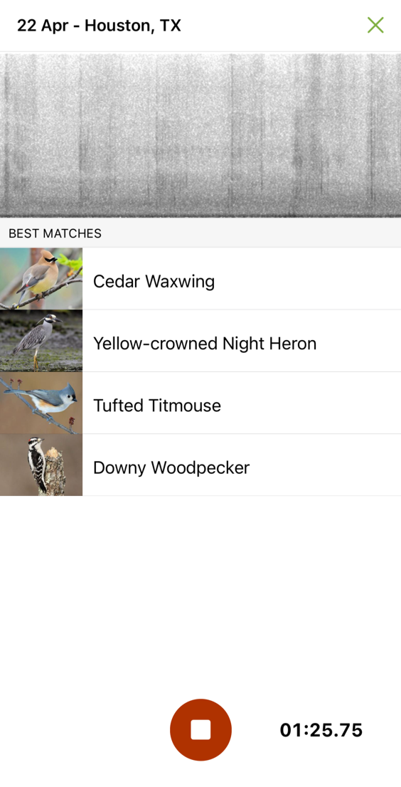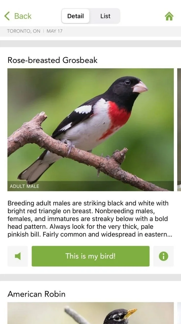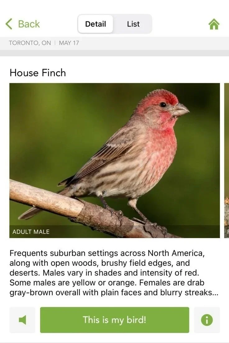 But today? Skip the gun! You don’t technically need anything but it helps to grab binoculars (I recommend Nikon Monarch 8x42s), any local field guide (‘Birds of Ontario’ is my best local and Sibley's Guides are always great ... plus J. Drew Lanham reminds us that used ones from thrift shops are fine!) and, of course, to download the aforementioned totally free and (generously) ad- and sponsor-free apps Merlin ID and eBird. They’re run by Cornell University (props to Cornell!) and so easy to use. The Merlin app’s newer “Sound ID” feature is often called ‘Shazam for Birds’ because you simply press a button and it immediately tells you what birds you can hear right where you’re standing! Like I was standing in Houston last year and pressed this and got this—