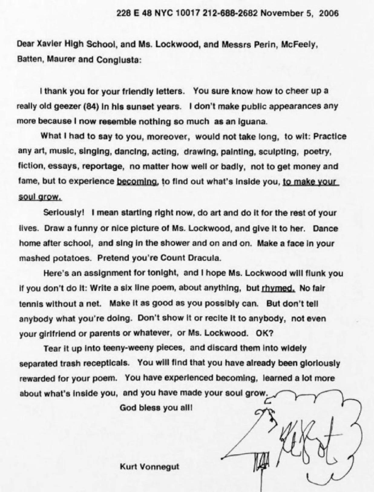 Dear Xavier High School, and Ms. Lockwood, and Messrs Perin, McFeely, Batten, Maurer and Congiusta: